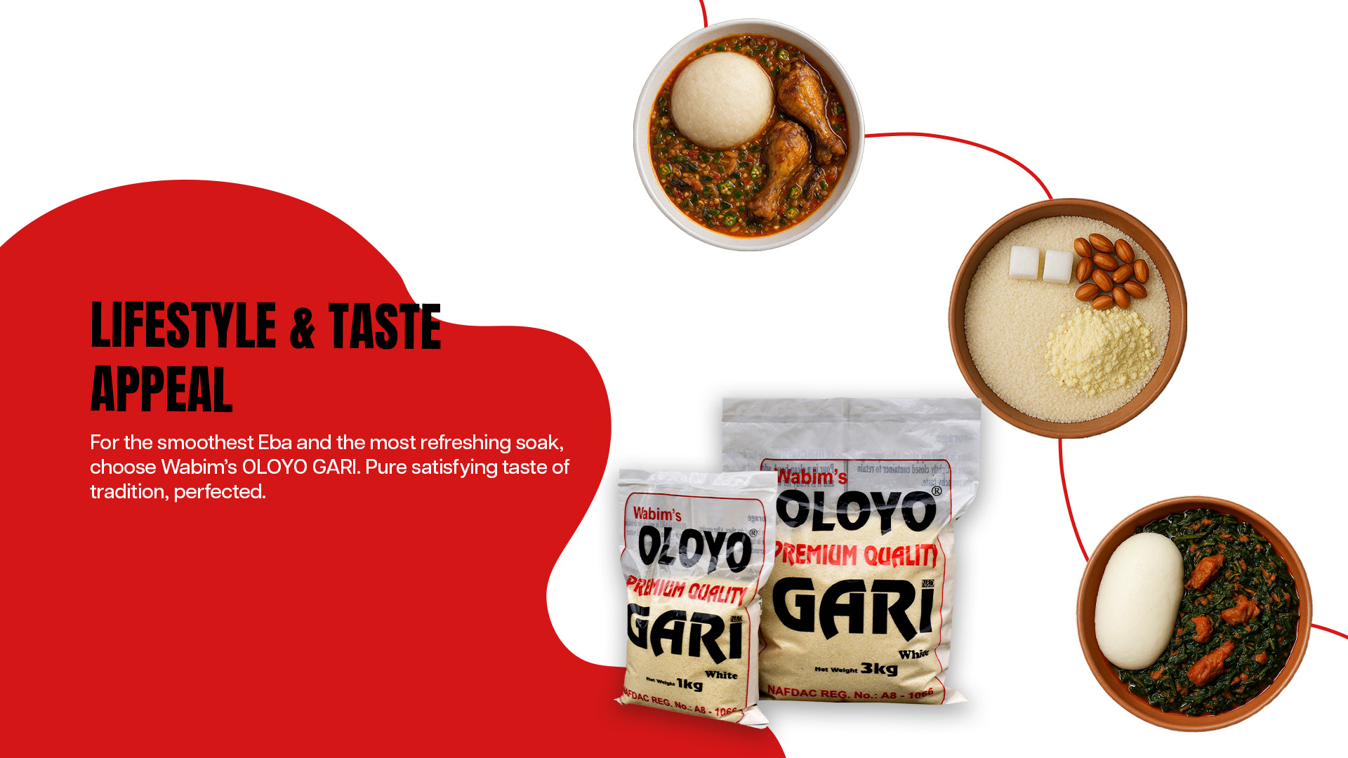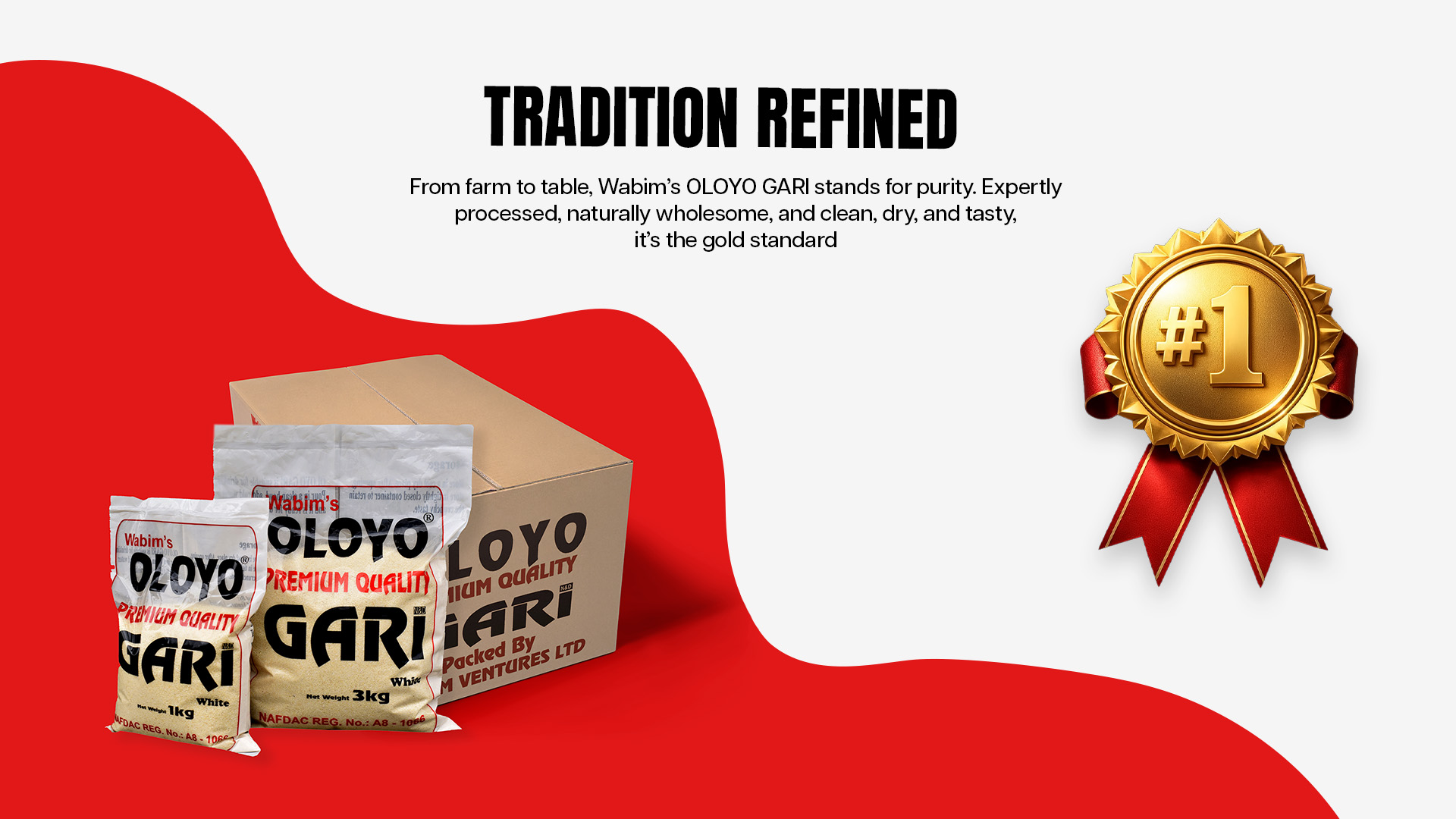 At Wabim, we're committed to preserving the authentic taste of Nigerian Gari while meeting modern hygiene standards. Our Oloyo Gari is crafted from carefully selected, hand-peeled cassava, processed using traditional methods enhanced with contemporary food safety practices. Every pack represents our dedication to quality, culture, and the trust of Nigerian families.